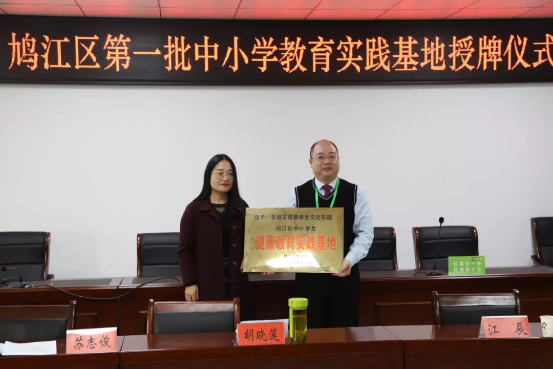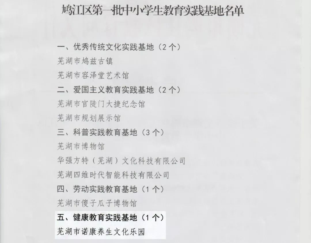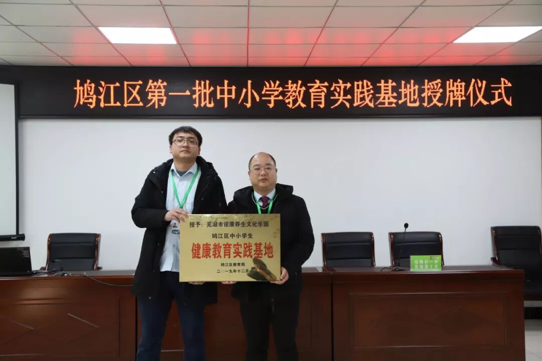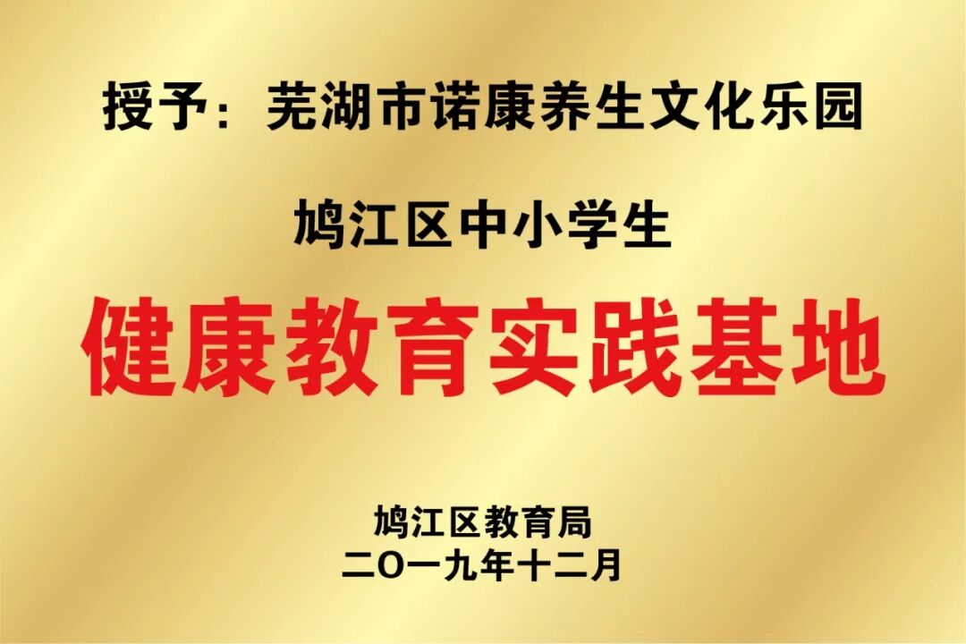 诺康集团自成立以来积极响应政府号召,组建自己的党支部,经常参加一些教育科普公益活动,诺康党支部在芜湖市鸠江区民营企业中党建工作中连续多年排行前三名。诺康集团是一家专业从事亚健康预防,营养食疗产品研发、生产、销售和服务于一体的高新技术企业。同时园区还是国家AA级旅游景区,自公司接到教育局下发的这个文件之后就积极准备材料,结合自己发展状况和优势,积极争取健康教育实践基地称号。一切的努力都是值得的,在鸠江区教育局下发的《关于授予芜湖市鸠兹古镇等九个单位“鸠江区中小学生教育实践基地”的通知》(鸠教德[2019]47号)文件中,诺康荣获鸠江区第一批中小学生健康教育实践基地的称号。并于2019年12月5日上午在鸠江区教育局由鸠江区教育局党委书记局长胡晓莲女士为我们诺康集团颁发了健康教育基地的铜牌。