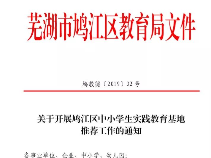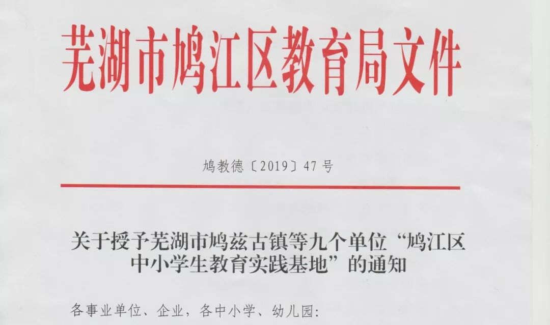 根据芜湖市鸠江区教育局下发的《关于开展鸠江区中小学生实践教育基地推荐工作的通知》(鸠教德[2019]32号),为认真贯彻党的十九大和全国教育大会精神,发展素质教育,切实落实教育部《中小学综合实践活动课程指导纲要》《中小学德育工作指南》,积极推动综合实践活动深入开展,注重培养学生核心素养,全面实施素质教育,区教育局拟命名一批鸠江区中小学生实践教育基地。